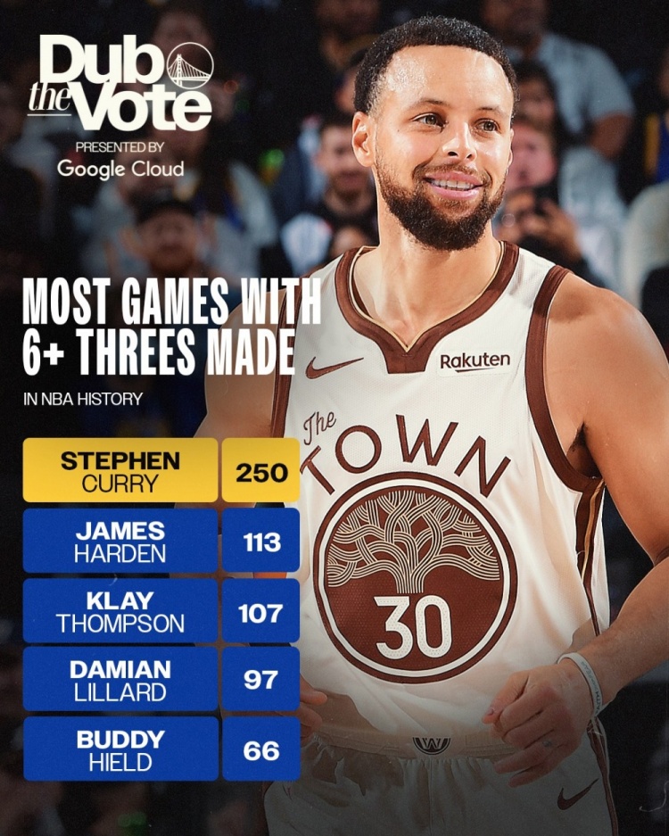 勇士官方晒出库里三分纪录,据统计,库里生涯至今已经有250场比赛至少投进6记三分,NBA历史高居第一!